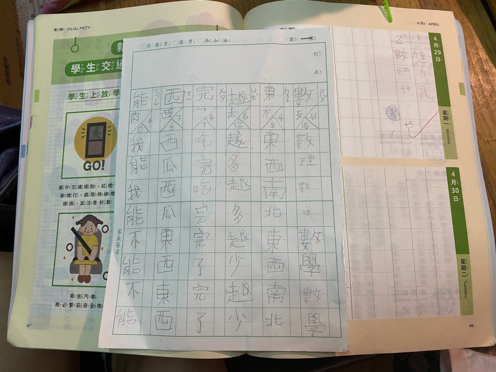 Over the two weeks, it was challenging to gauge what they were learning in school. I could only get an idea from their homework. For Chinese (國語), I learned that the school had covered Zhuyin quickly during the first semester of first grade, while we joined in the middle of the second semester. Each lesson introduces 15 characters that students are expected to master over 2-3 weeks. Homework involves repeated copying of these characters and then using them to write phrases the next day, which takes us about 30-40 minutes due to the twins’ unfamiliarity with writing.