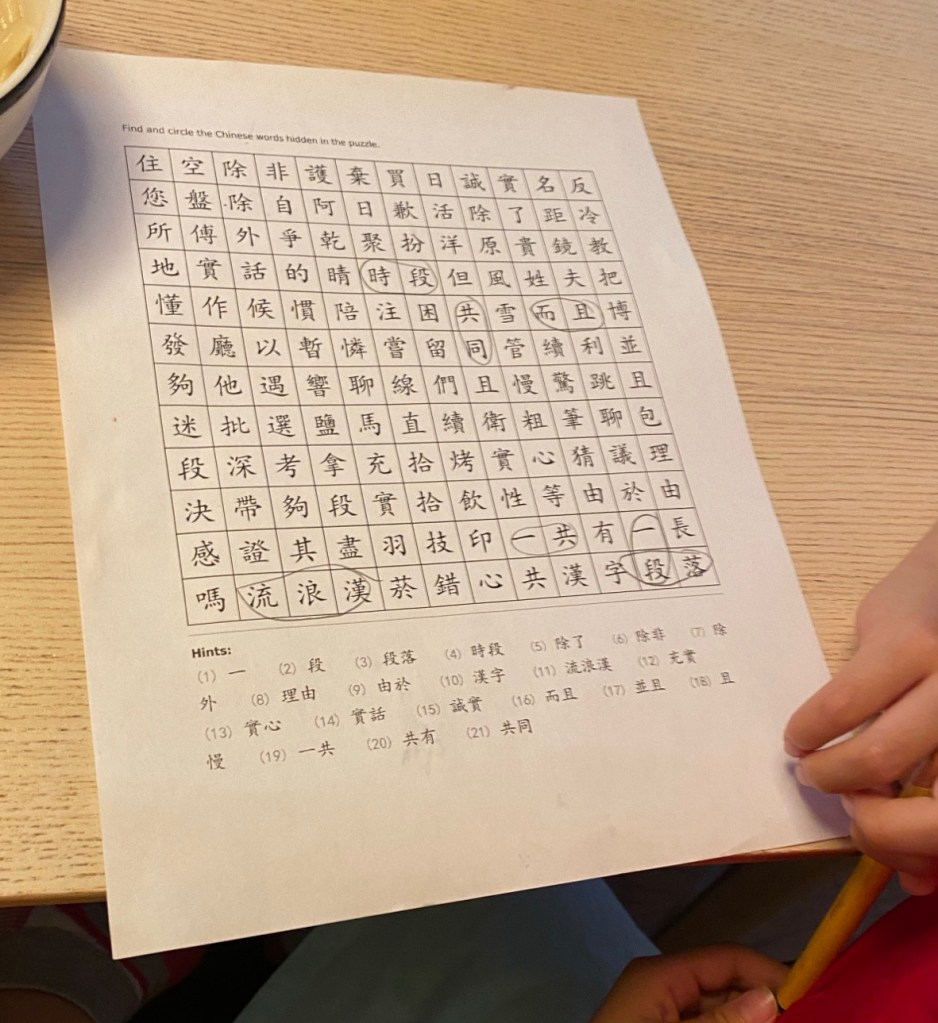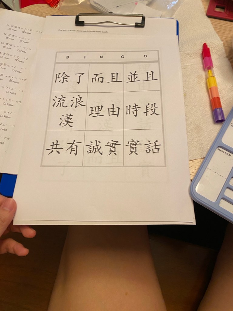 Additionally, I’m using the characters he doesn’t know to create worksheets on PurpleCulture.Net’s Chinese tools, including bingo, word mazes, word puzzles, and missing strokes activities. Both kids enjoy these worksheets, and I’ve set a goal of completing 50 worksheets (I modified the sheet originally for books) for a bubble tea reward. They’re excited about this challenge and eager to do more.