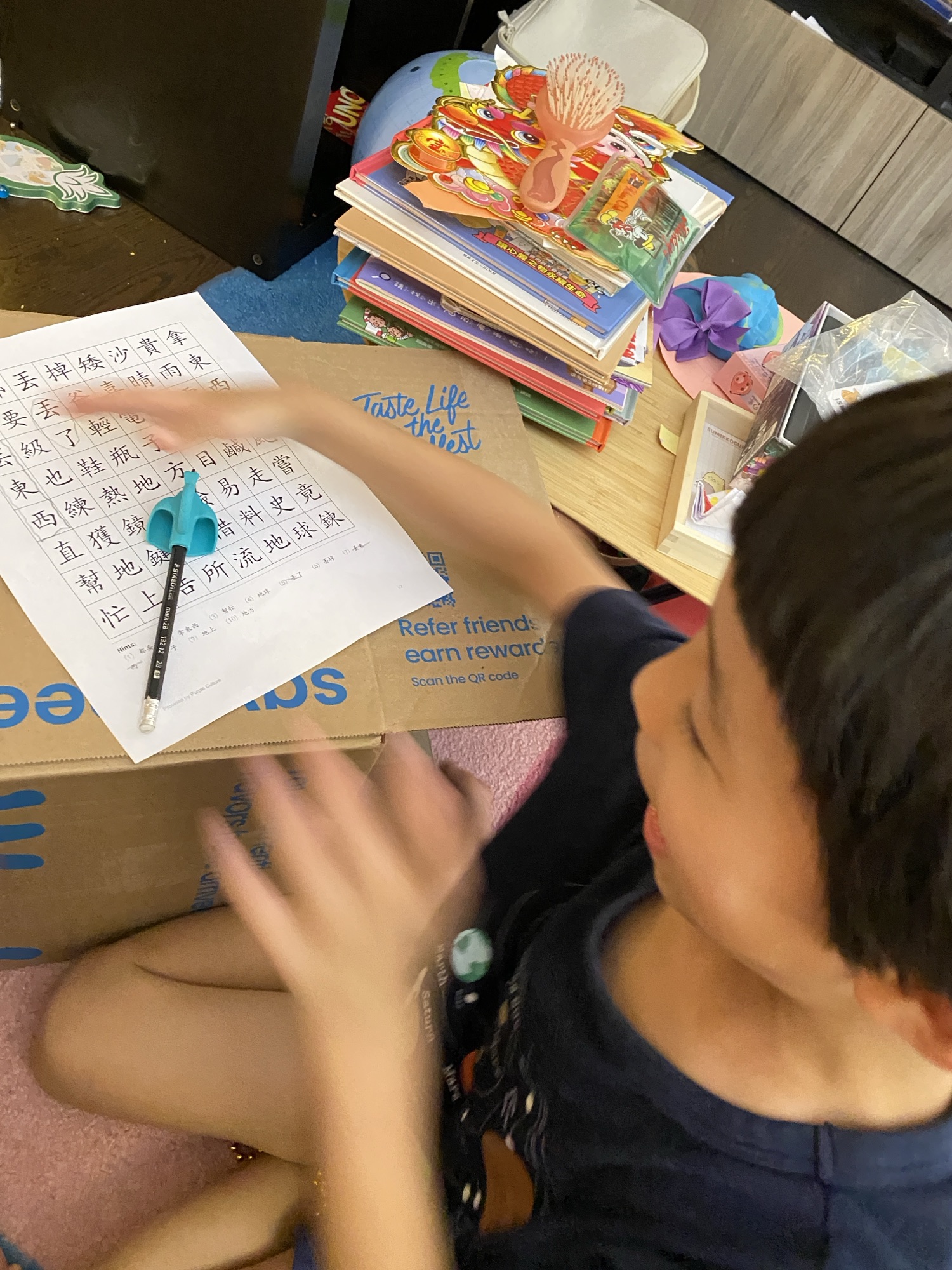 After two weeks, things are going smoother than I thought. Initially, there was frustration and tears because he couldn’t remember some characters, but with daily practice, he’s starting to remember even less common words like 萬 and 脖.