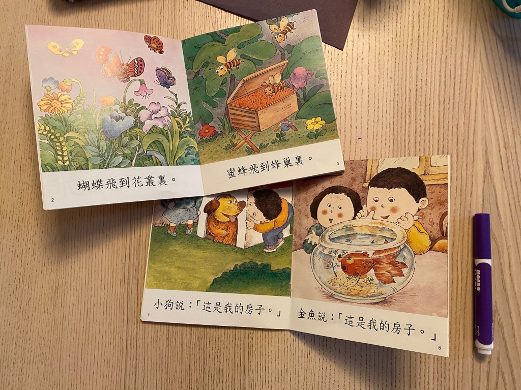 That’s when I brought out those baby books we used to read and had him try reading them himself. To my surprise, because the stories were so short, he read three simple Chinese picture books in one sitting. The short sentences allowed him to blend the zhuyin quicker, and the sense of accomplishment from reading these books was significant. I then went ahead and got more of those books for him to read this summer.