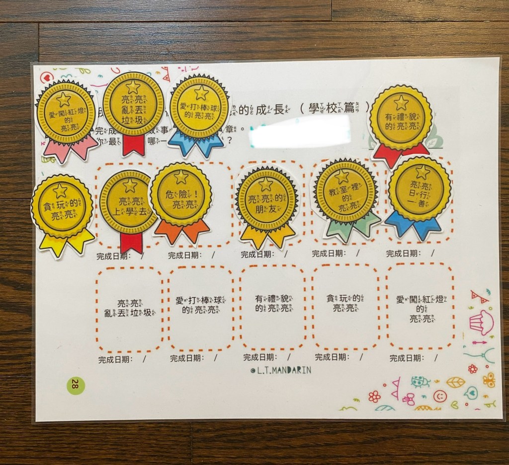 In his 100 books challenge, because those leveled readers are so short, he could only get a prize for every 20 books he read. Now, seeing him able to read longer books, especially starting with 亮亮的成長—almost the number one bridge book used by most online schools—I told him he can now earn a prize for every 10 books he reads, just like his sister. He looked surprised but happy, knowing he’s accomplished something and is getting closer to independent reading (just closer, we’re not there yet).