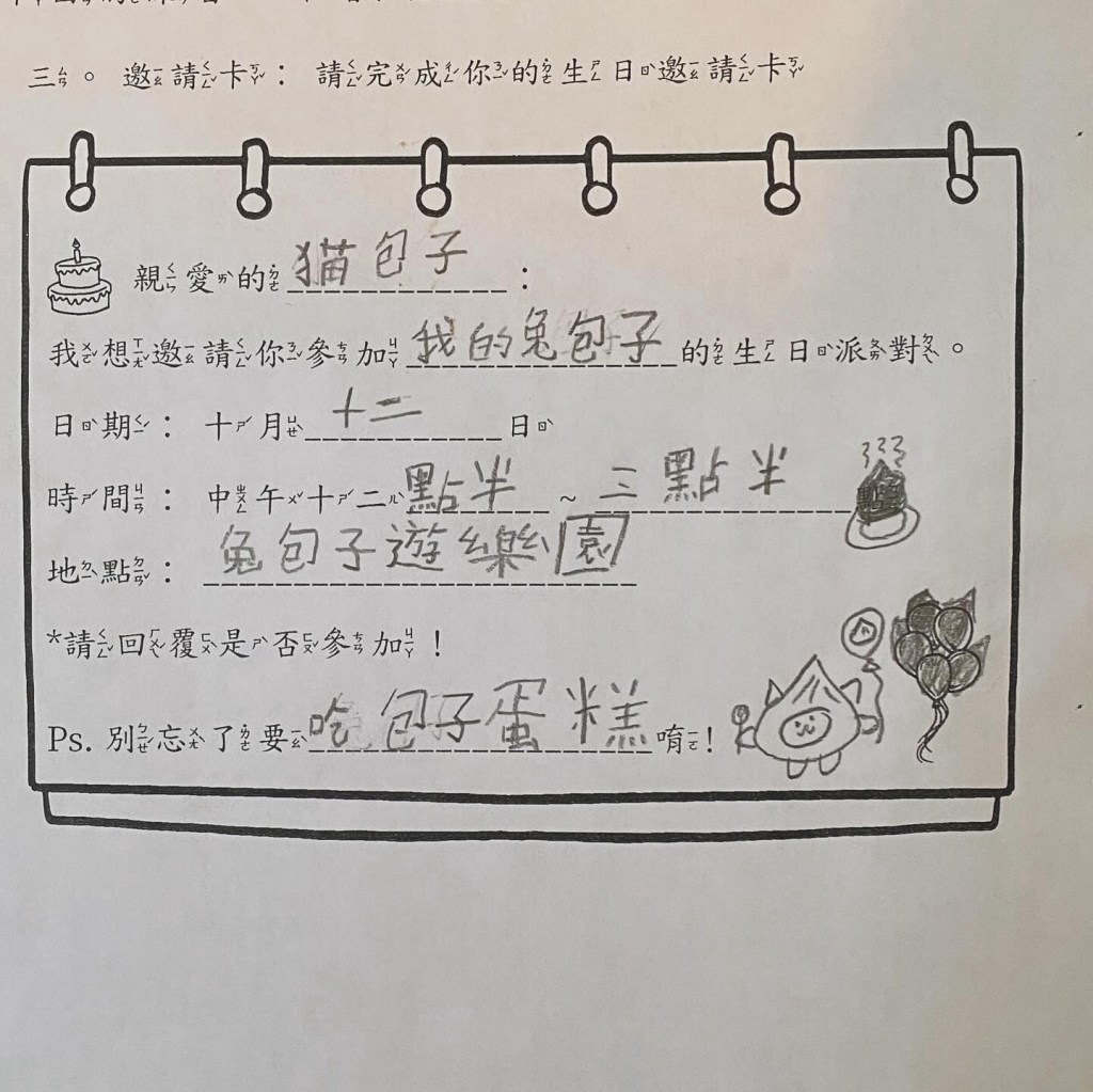 This made me appreciate even more the tutor I found for Little Bun. The exercises she’s doing with her mirror what’s happening at school, but in Chinese. Recently, the homework includes sentence building (造句), and the tutor is gradually guiding her to write short poems and even giving her assignments like creating birthday invitations.