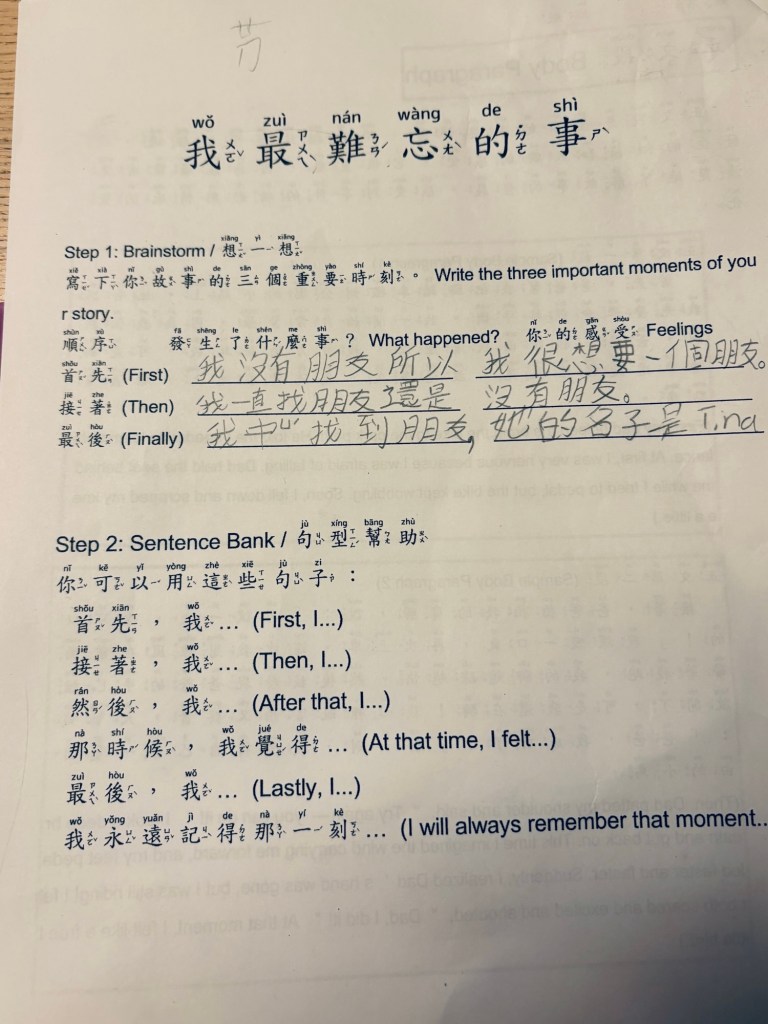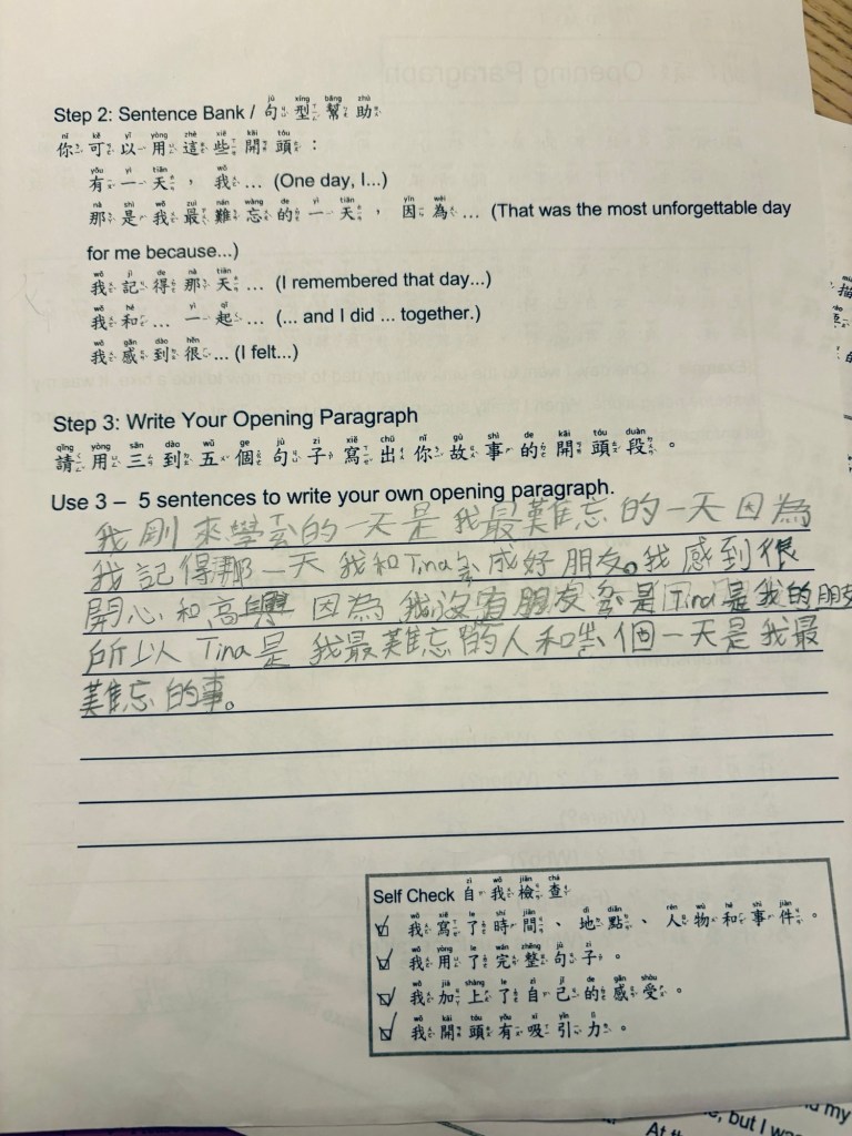 Seeing all of this reminded me of how I learned English back in Taiwan. We used similar structures and sentence patterns to help us write paragraphs. Over the years, I’ve come to realize that the process of learning any language often looks similar: building vocabulary, developing a sense for the language, reading a lot. Whether you’re learning English in Taiwan or learning Chinese overseas, the steps are pretty much the same. What matters most is persistence—keep going, keep trying, and keep practicing.